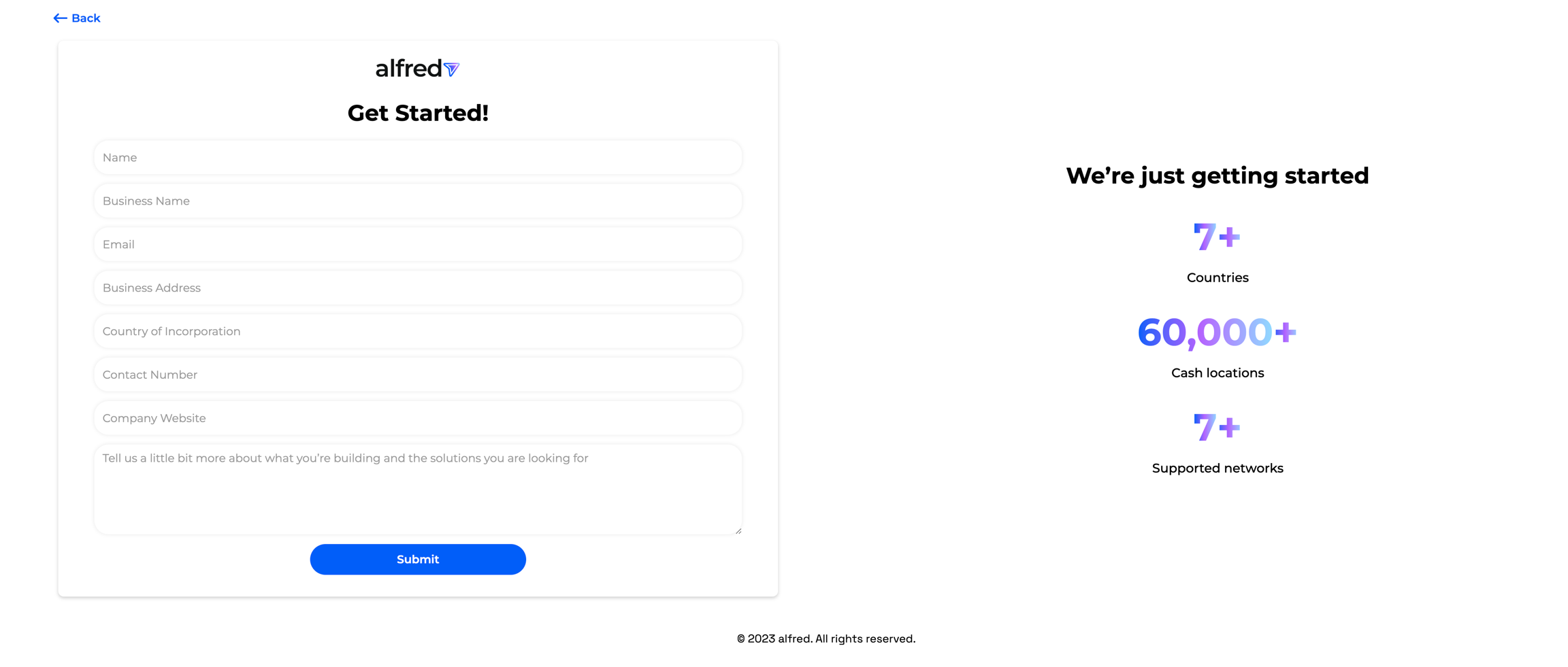 We only need a bit of information for you to start experimenting with our APIs. First, you need to create sandbox account, which gives you access to our free payments rail playground. Head over to https://sandbox.alfredpay.io/ and register by filling out our quick form.
